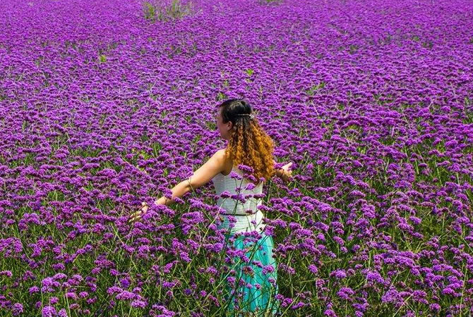馬鞭花景區(qū),近百畝馬鞭草花田里,鮮花盛開。遠(yuǎn)遠(yuǎn)望去,如同為綠色大地鋪上一層紫色的地毯。微風(fēng)拂動(dòng)下,紫色的馬鞭草愈發(fā)動(dòng)人,吸引了不少游客前來拍照留影。